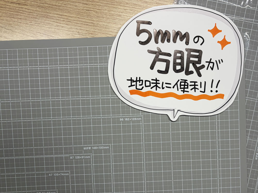 5mm方眼のカッターマットになぜそんなに拘るかと言うと、手書きPOPをカッターで切るときには「切りたいサイズ」があるんです。とくにPOPケースやラミネートフィルムのサイズに合わせて切りたいときに「5mmずれる」は致命的なミスになります!