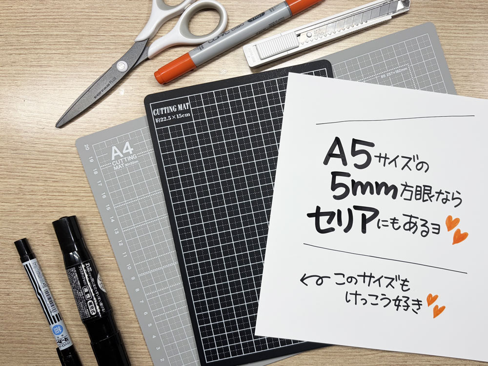 そんな便利な5mm方眼のカッターマット、A4サイズはキャンドゥにしかありませんが、A5サイズならセリアとDAISOにもありますよ!